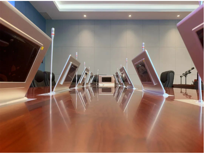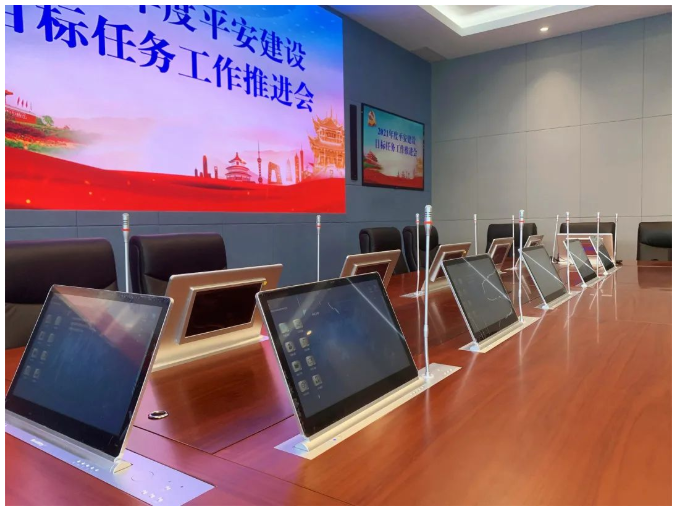 在12人的會(huì)議圓桌這里,安裝了12套WZH-L2LM 15.6"嵌入升降式無(wú)紙化終端,帶有電子桌牌和升降鵝頸發(fā)言話筒。它們具有銘牌顯示、文件批注、同屏廣播、分組廣播、異步瀏覽、跟蹤主講、外接信號(hào)顯示、臨時(shí)文件、主席控制等多種強(qiáng)大的功能;支持一鍵切換到Windows桌面,將Windows或其他軟件的操作界面同屏顯示到其它無(wú)紙化終端和大屏幕。