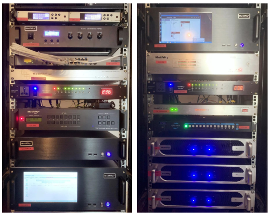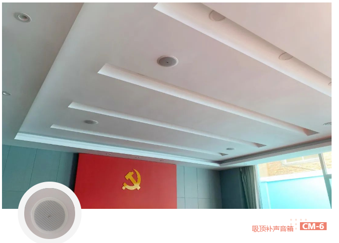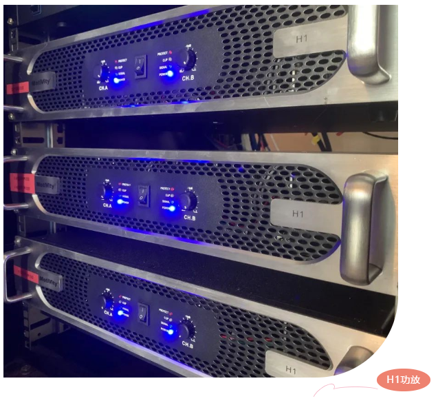 使用了兩只PAL83線性陣列音柱作為主擴(kuò)音箱,嵌入式安裝于大屏幕兩邊,天花安裝了6只CM-6吸頂補(bǔ)聲音箱(分兩只一組,共3組),搭配3臺(tái)H1功放進(jìn)行揚(yáng)聲器功率放大。整體上既保證了現(xiàn)場(chǎng)擴(kuò)聲均勻度,又能與環(huán)境融為一體,視覺(jué)上顯得