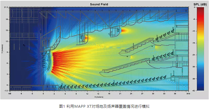 當獲得足夠的場地信息之后,需要利用揚聲器廠家提供的模擬軟件(或者通過Ease Focus這種基于GLL文件的通用設計軟件)進行建模,這些軟件可在可視化的條件下,實時調整并計算不同設計方案的覆蓋均勻度以及聲壓級分布,較為復雜的模擬軟件(如Ease)甚至可以將反射和墻面材質的吸聲特性都考慮在內,實現對反射情況的模擬(見圖1)。系統建模和預測的重要作用在于讓系統工程師在裝臺開始之前就能夠做好全部的計劃和準備工作,進而起到減少正式施工時長并提高工作效率的作用。
