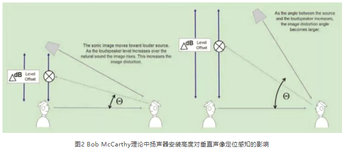 任何解決方案都存在一定的局限性。這些局限性主要來自于劇場的尺寸、舞臺的結構、觀眾席座位的分布以及劇場的聲學環境等要素。使用中置揚聲器對于那些舞臺鏡框特別高的場地可能不是一個好的選擇。吊掛的高度決定了聲源發出的位置(見圖2),若揚聲器與觀眾席垂直方向的夾角大于30°,位于前排的觀眾就有可能會感覺到垂直方向上的聲像漂移,產生人聲或對白來自頭頂而非前方的感覺。此時,設計時可以考慮通過臺唇補聲系統來覆蓋前排觀眾席,中置系統從3排或4排之后的區域開始覆蓋。