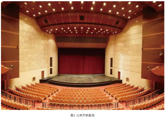 標準劇場中,中置揚聲器組的安裝通常分為暗裝和明裝兩種。暗裝一般是安裝在舞臺鏡框上沿預留的聲橋當中,如北京天橋劇場(圖3)。明裝則是吊掛在舞臺燈桿或預留的吊點上,如北京天橋藝術中心大劇場(圖4)。暗裝對觀眾的視覺影響最小,如果劇場擴聲系統設計合理,建筑聲學指標達標,且在鏡框高度不是很高的情況下,劇場中置聲道暗裝是最好的安裝方式。但是國內劇場的實際情況并不樂觀,且不同演出的系統工程師和音響設計師都有各自的設計和考量,暗裝中置聲道位置又基本不可調整,所以很多劇場中暗裝的中置聲道使用率很低。明裝的中置聲道更便于安裝、拆卸以及調整,更加適合流動性強的演出,因此,越來越多的現代化劇場采用這種安裝方式。