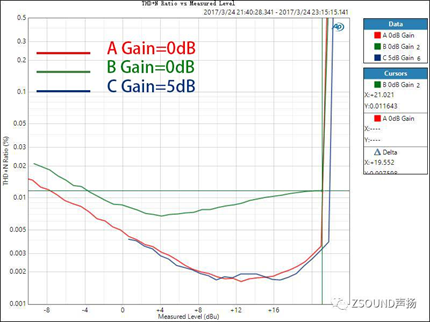 對于數字調音臺,我們不僅要關心話放增益在0dB時的THD+N比率,還需要了解到,話放增益在不同位置時的情況,因為這是使用中的實際情形。話放的增益在不同大小時,其引入的噪音和失真也是不同的,了解這一點對于用戶正確設置增益也很有參考意義。