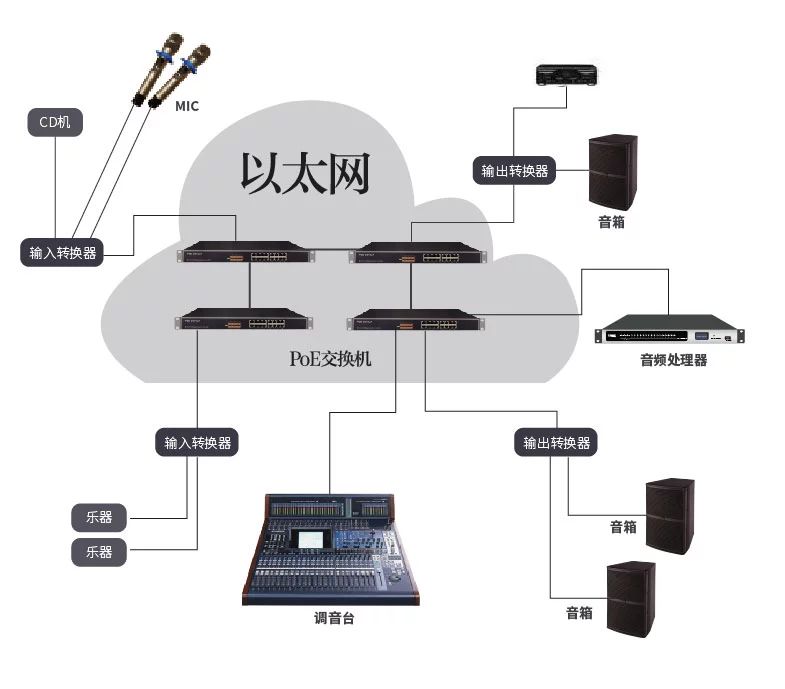 Dante技術可以在以太網(100M或者1000M)上傳送高精度時鐘信號以及專業音頻信號并可以進行復雜的路由。可以任由音頻信號在以太網中使用TCP/IP方式任意傳送,而且在這個過程中保持了信號的精確還原。下圖直觀反應了DANTE網絡的連接工作方式: