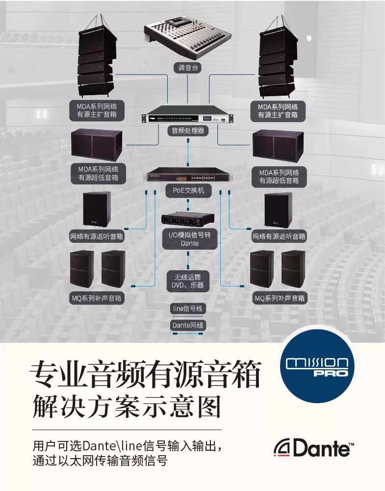 Mission Pro 專業網絡音頻采用國際先進技術,通過巧妙的內部結構設計,集成了 DSP、AMP、Dante 技術,提供即時的編組和聲學優化,更輕松、更快捷地呈現出眾的聲音效果。