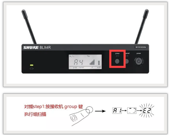 2、打開對應發射機的電源,將組和頻道更改為與接收機匹配。