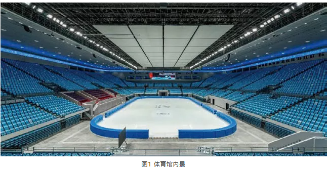 2022年北京冬奧會(huì)的主要比賽用館首都體育館,其建筑面積45 406 ㎡,其中,地下一層為38 842 ㎡,地上四、六層6 564 ㎡,建筑高度28.16 m。一層的中心場(chǎng)地內(nèi)設(shè)有31 m×61 m具有多功能轉(zhuǎn)換的標(biāo)準(zhǔn)冰場(chǎng),大頂鋁板造型至冰場(chǎng)的高度為20.6 m,觀眾席區(qū)設(shè)有15 400個(gè)座位,如圖1所示。