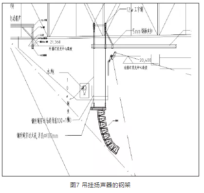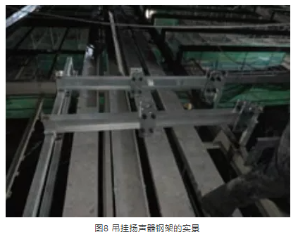 在揚(yáng)聲器系統(tǒng)吊掛過程中,由于首都體育館保留了原有大頂球型網(wǎng)架結(jié)構(gòu)、馬道,在球型網(wǎng)架的結(jié)構(gòu)下還有鋁板造型結(jié)構(gòu)以及龍骨,而揚(yáng)聲器系統(tǒng)的吊掛點(diǎn)位于大廳頂層鋁板之上,需要穿過結(jié)構(gòu)下懸桿、鋁板和鋁板固定龍骨層,避開燈光線路以及馬道,并且每一組線陣列揚(yáng)聲器的安裝位置不相同,需要精確的定位,以滿足現(xiàn)場(chǎng)覆蓋的范圍及角度?;谶@種情況,在進(jìn)行了實(shí)地勘察測(cè)量后,經(jīng)各方討論,最后選擇了單獨(dú)設(shè)計(jì)安裝鋼結(jié)構(gòu)吊點(diǎn)的吊掛方式。根據(jù)現(xiàn)場(chǎng)不同的位置,定制吊掛揚(yáng)聲器的鋼架,如圖7、圖8、圖9所示,吊掛高度可以在鋼架上調(diào)整。這一結(jié)構(gòu)不僅可以避開場(chǎng)地照明光路等,還可以應(yīng)對(duì)施工過程中馬道等一些設(shè)施的更改。