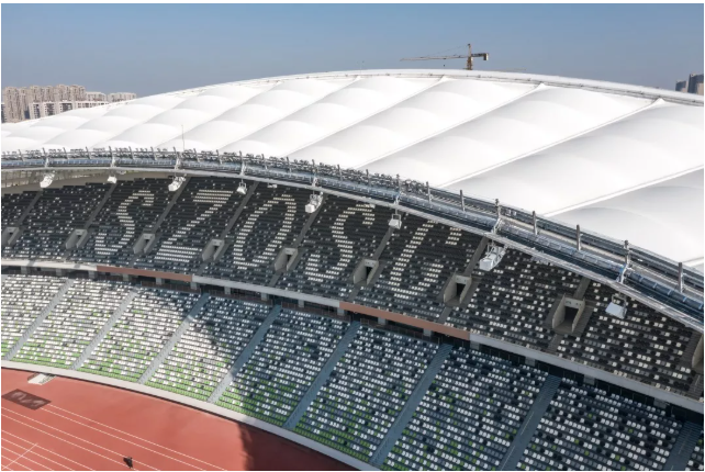 蘇州奧林匹克體育中心體育場是迄今為止中國第一座馬鞍形單層索膜結構屋頂設計的體育場,通常則為鋼架結構,這一次的特殊結構意味著只能借助全場40個索頭拉住膜。