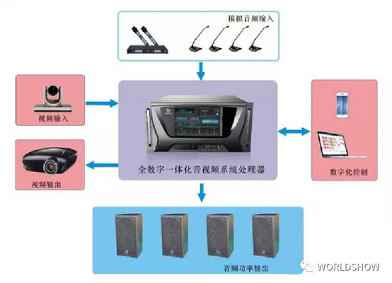 輸出端可以獨(dú)立完成對(duì)輸出端音頻的整理,包括音箱的標(biāo)準(zhǔn)化和聲學(xué)環(huán)境的補(bǔ)償處理、視頻終端的多窗口拼接處理、傳輸補(bǔ)償和控制系統(tǒng)的多種格式的控制信號(hào)的輸出等等。