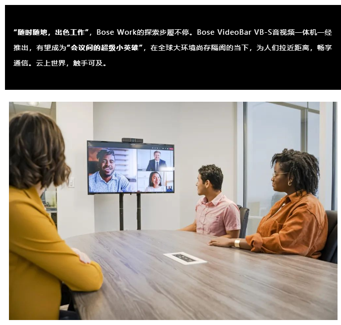 無論身處世界何地,體驗始終如一”,以此為愿景,Bose Work推出年度新品Bose VideoBar VB-S音視頻一體機,為疫情常態(tài)化下的全球會議場景提供全新選項。