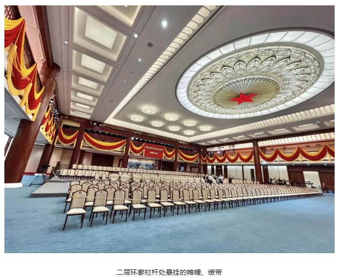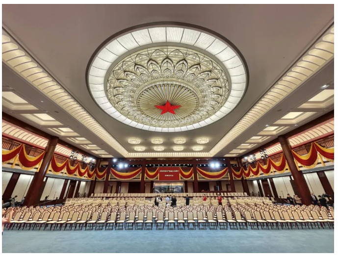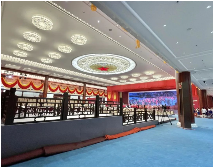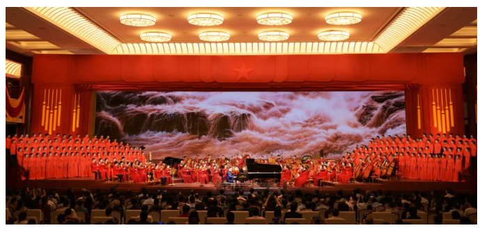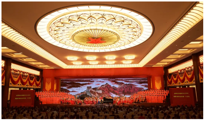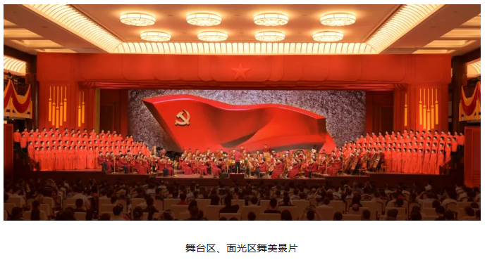 演出當晚,紅色大廳燈火通明,用紅旗元素搭建、黃色綬帶裝飾的舞臺與帷幔一起烘托出慶典氛圍,大廳頂部中央鑲嵌的五角星熠熠生輝。