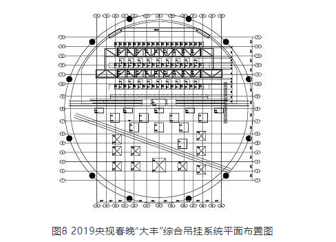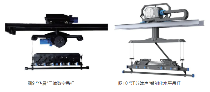大豐、華晨、江蘇建聲等企業的吊掛設備(見圖8~圖10),不僅滿足吊掛燈光設備的需求,還針對布景、道具和大屏幕等特殊設備做了專門設計。通過數控調速、變頻調速、雷達防碰撞、激光測距校準、運動速度反饋自控、運動參數預設記憶等技術手段,有效實現了多功能吊桿的升降、平移、旋轉等多維度動作的精準控制,并在運行精度、靜音和安全性等方面達到了動態參與演出的水平,在諸多重要演出中通過吊掛設備使燈具、道具和大屏幕等設備多維運動融入演出環節,為節目增加了重要的表現手段。