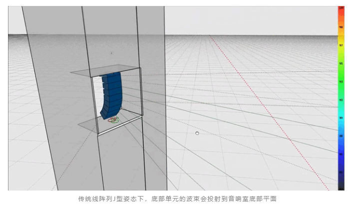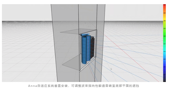 在暗裝的方式下音響室空間通常狹小緊湊。在本項目中,音響室的底部平面距離陣列僅10厘米。如果采用傳統(tǒng)線陣列的擴聲系統(tǒng),陣列會形成J字型物理姿態(tài),不僅占用較大的安裝空間,J型底部的音箱單元還有可能將聲能投射到音響室的底部平面上,導(dǎo)致大部分高頻能量無法穿透出來,從而無法覆蓋到一部分前區(qū)的觀眾區(qū)。選用Anna,它的垂直吊裝方式既能節(jié)約了安裝空間,還能將高中低頻單元統(tǒng)一的盡可能靠近透聲幕,躲避音響室底部平面對波束的遮擋,最終實現(xiàn)幾乎全場的覆蓋。