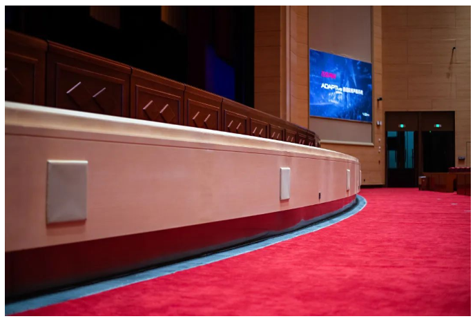 舞臺臺唇固定安裝了多只CMI5,為觀眾席前排座席補充中高頻響應(yīng)。CMI5是采用同軸設(shè)計的超緊湊兩分頻揚聲器,可以提供優(yōu)秀的指向性控制和均勻一致的聽音體驗。針對安裝位置過高,而造成的兩側(cè)主擴揚聲器覆蓋不足的情況,在左右八字墻大屏下方位置,固定暗藏了MKD896點聲源揚聲器予以補充。
