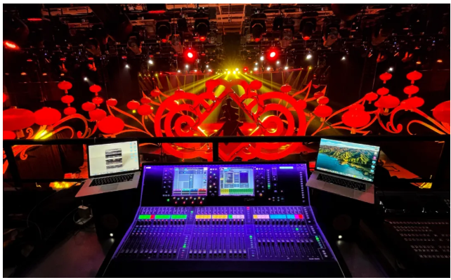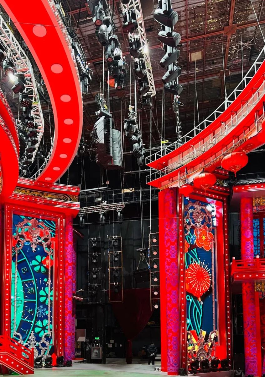 此次遼視春晚舞美設計較為復雜,舞臺頂部使用了喜慶的中式風格,有中式建筑的頂部橫梁,還懸掛有多只大紅燈籠。為滿足拍攝的美觀需求,曾多次調(diào)整主擴系統(tǒng)的吊裝高度和位置,最終主系統(tǒng)被吊掛在舞臺兩側(cè)上空10.5米的高度,隱藏在中式風格弧型橫梁的后部,毫無違和感。
