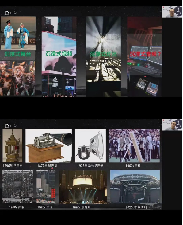 通過摩托車環繞的音效視頻,介紹了主講嘉賓與其團隊如何通過3D科技制造環繞音效,帶給觀眾沉浸式的聽覺體驗。并且講解追蹤器與拾音話筒如何結合實現實景與藝術結合。音響與舞臺、燈光、布景的融合是未來演出的一種趨勢,能帶給觀眾更真切的體會。