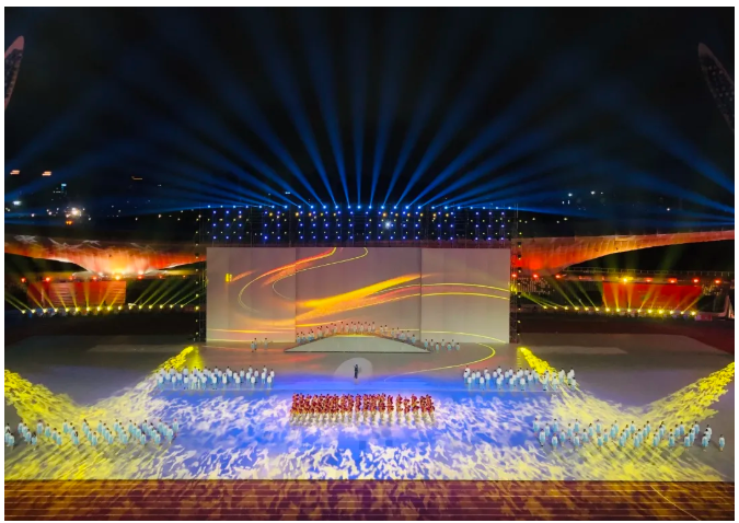 為確?,F場最佳的視聽體驗效果,本屆體育大會擴聲系統采用源自德國的EV32只X1I-212/90-FGB垂直線性陣列搭配12只X2-212/120心形指向性超低作為主擴組合,16只EVF-2151D垂直線性陣列搭配4只X12-128次低頻音箱及8只EVF-1181S超低音箱作為兩側補聲組合,主席臺和演員返聽由8只多功能鏡像全頻揚聲器MFX-15MC擔任,整個擴聲系統由32臺PX5:4功放進行驅動。