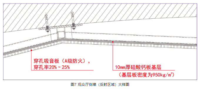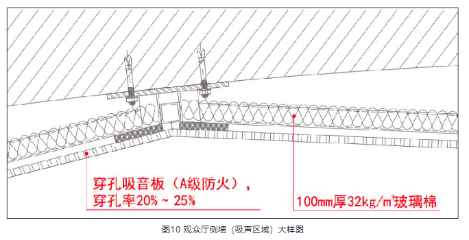 3) 側墻中段內凹區域(圖4玫紅色墻面),2 m 以下人員活動高度范圍內(圖9),保留裝飾做法,做強吸聲處理,避免聲聚焦。穿孔吸音板穿孔率20%~25%,板后應形成封閉空腔,空腔內填100 mm厚32 kg/m3玻璃棉,見圖9、圖10。側墻吸聲區域與非吸聲區域裝飾效果保持統一。