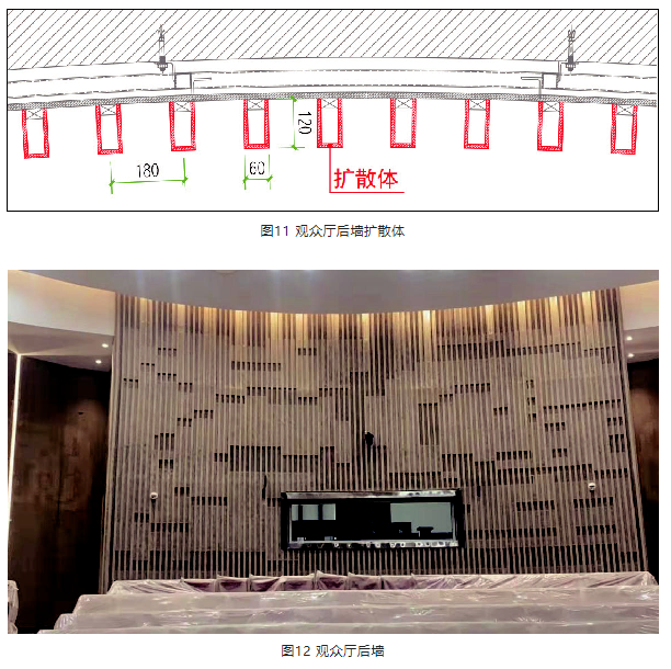 4) 裝飾在后墻(圖4磚紅色墻面)設置了豎向造型線條,將功能性與裝飾性相結合,能與墻面造型及飾面材料有機融合。室內設計在側墻飾面材料拼縫間規律設置豎向LED燈帶,后墻豎向線條與側墻飾面材料風格和諧統一。該豎向擴散體寬度60 mm,突出高度120 mm,間距180 mm,擴散體尺寸較小。見圖11、圖12。