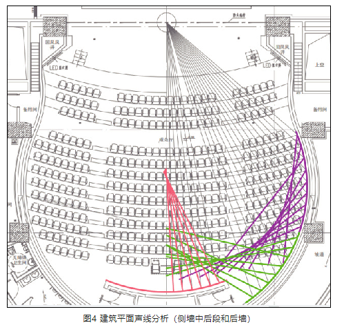 5) 側墻后段內凹區域(圖4綠色色墻面)聲聚焦程度較弱,且聚焦點不在觀眾席。該區域如果做吸聲處理,會導致廳內吸聲過量;如果做擴散處理,與側墻其他區域裝飾風格不統一,略顯突兀。因此,側墻后部內凹區域未做處理。