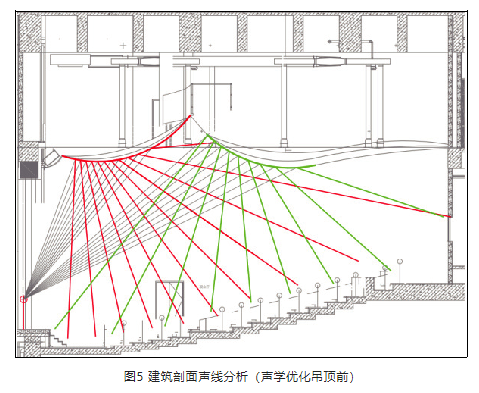 建筑剖面聲線分析(聲學優化吊頂前)見圖5,建筑剖面聲線分析(聲學優化吊頂后)見圖6。