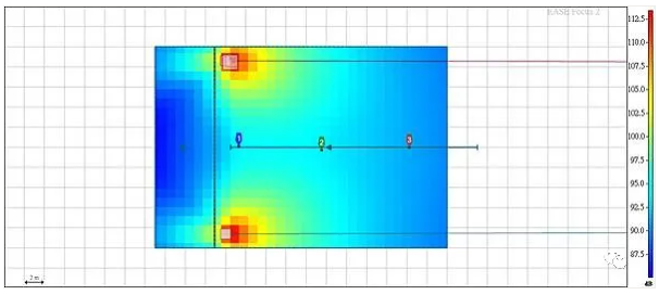 我們來看舞臺的音壓分布圖側視圖,toe in 前音箱后方舞臺的音量,每一方格0.5m